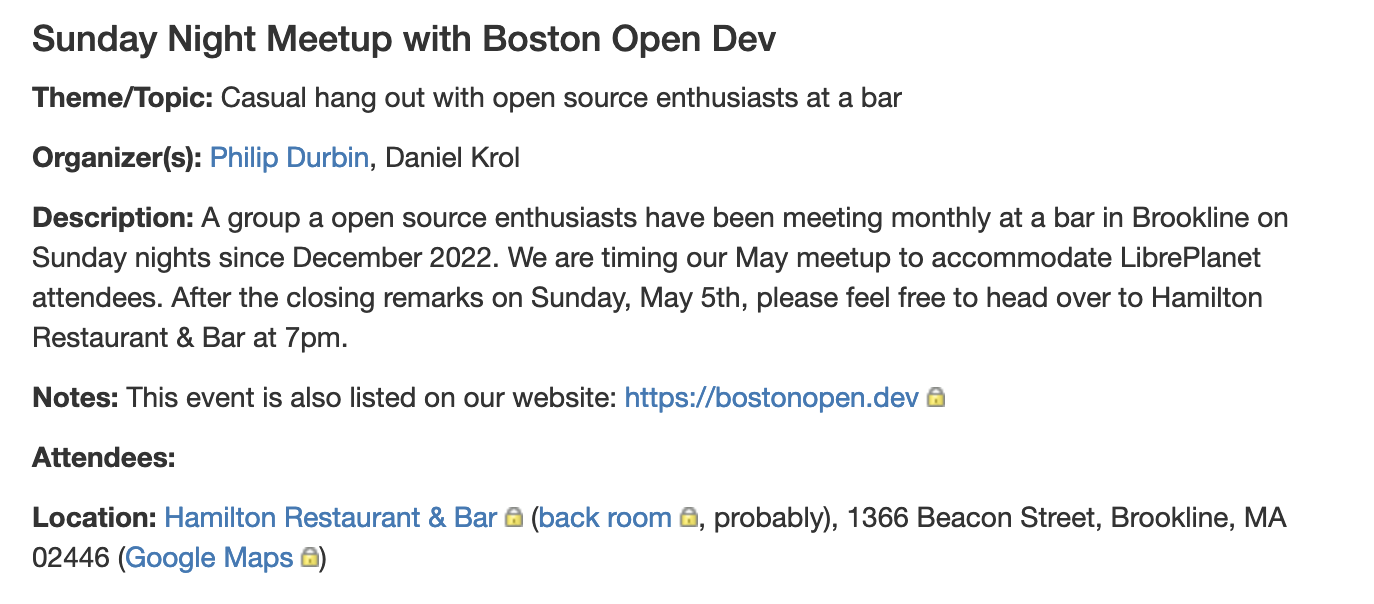 I just updated https://libreplanet.org/wiki/LibrePlanet:Conference/2024/BOF#Sunday_Night_Meetup_with_Boston_Open_Dev to link to https://floss.social/@bostonopen